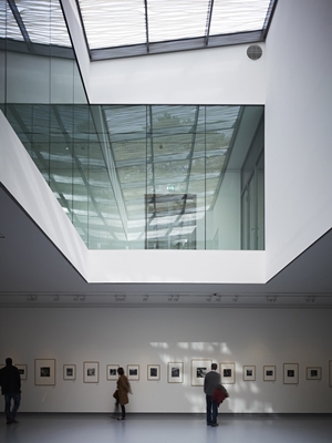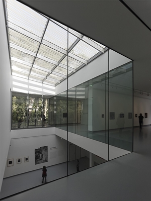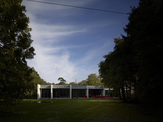 “De entree ligt tussen de villa en de uitbreiding als een transparante link tussen oud en nieuw. De multifunctionele zaal wordt veel voor muziek en bijeenkomsten gebruikt, en ligt dan ook met de horeca aan de beeldentuin op het zuiden. De zaal voor tijdelijke exposities bevindt zich ondergronds, maar krijgt daglicht via een vide.”