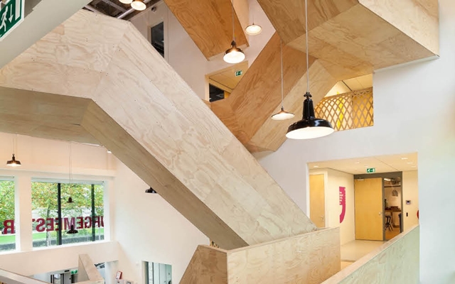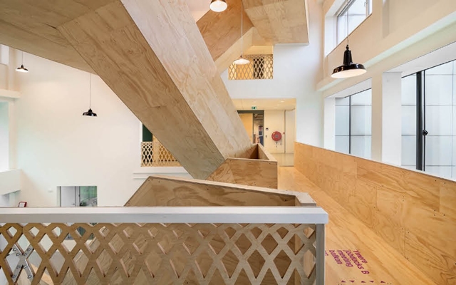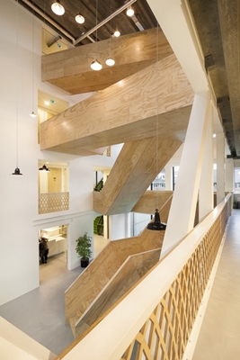 noemen wij de ruimte die we midden in het gebouw hebben gemaakt. Een plek die mensen bij elkaar brengt. Uit de betonnen vloeren hebben we een veertien meter hoge vide gezaagd met daarin een reusachtige trappartij die zich dwars door de open ruimte een weg naar boven baant, onderwijl de verdiepingen aan elkaar hakend”, zegt Studioninedots.