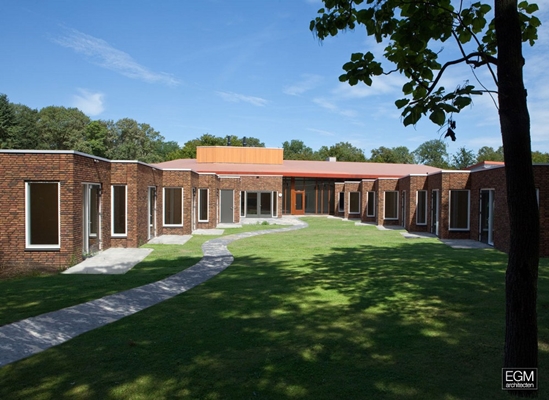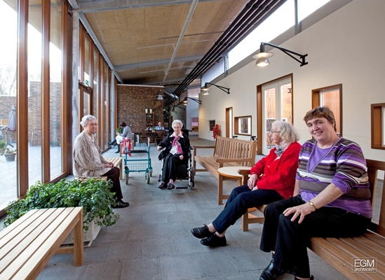 bijvoorbeeld is kleinschalig zorgcomplex Eldershof gerealiseerd met een eenvoudige plattegrond met een entree, een woonkamer en een gang met slaapkamers en sanitaire ruimten.