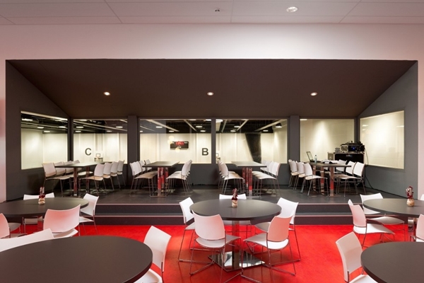 Via twee centrale entrees betreedt de bezoeker de nieuwe centrale ruimte. Daar splitsen de verkeersstromen zich: de bezoekers gaan via een vuurrode trap omhoog naar het sportcafé. Vanuit het café zijn de verschillende tribunes bereikbaar. De sporters vinden op de begane grond de kleedkamers en de zalen.