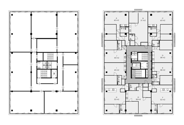 Het rechthoekige pand heeft een asymmetrisch gelegen betonnen kern met een lift en twee trappenhuizen. De gang rondom de kern geeft toegang tot de omliggende ruimten. In de nieuwe situatie is een deel van de gang toegevoegd aan de kleinste appartementen. In verband met vluchtroutes is een nieuwe rondgang gecreëerd. De betonnen kern is doorgebroken en de lift is verplaatst.