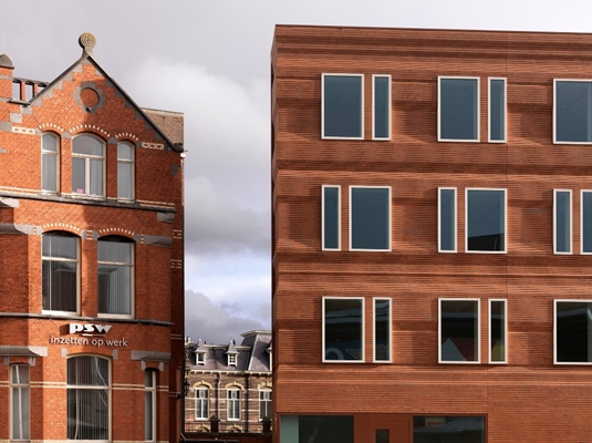 Met het oog op de inpassing in de stedelijke context, hebben de architecten de voorgevel een klassiek ordening van plint, hoofdvolume en kroonlijst gegeven. Als gevelmateriaal heeft diederendirrix architecten gekozen voor baksteen. De kleur en de dunne voegen zijn een hedendaagse interpretatie van de hier veelvoorkomende geel-rode baksteengevels.