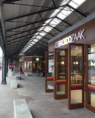 ontworpen gebouwtjes zijn een vestiging van Starbucks en De Broodzaak gehuisvest. In het ontwerp zijn de houten puien van het station vertaald.