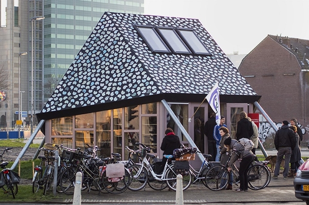 , buurtbewoners en studenten. De dakbedekking bestaat uit 2300 handgemaakte dakpannen waarvan een deel een persoonlijke tekening heeft gekregen van bewoners uit de stad.
