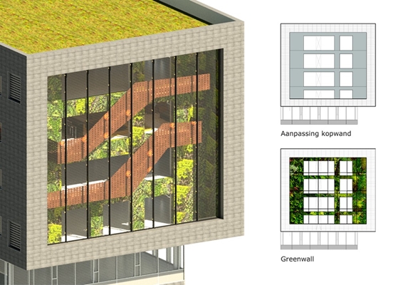 “Door de wanden te voorzien van “Green Walls” ontstaat een enorme verticale tuin waarin een aantal balkons hangen die door sculpturaal vormgegeven trappen met elkaar verbonden worden en zo met elkaar een promenade vormen”, besluit BFAS.