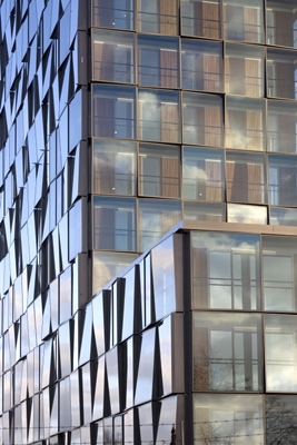 Uit dit dilemma is een structuur voortgekomen van geanodiseerde lamellen, die verticaal en gedraaid voor de gevel zijn geplaatst. De onderlinge afstanden en posities variëren over de hoogte van het gebouw, zodat verschillende gradaties in transparantie ontstaan. De lamellen blokkeren het directe zonlicht, bieden weids uitzicht over de omgeving, en geven het gebouw een ‘stoere’ uitstraling.