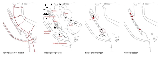 “Het plan wordt in stappen ontwikkeld door op specifieke plekken te investeren in betekenisvolle openbare ruimte, verbindingen met de stad, nieuw programma op de kade, aanlegvoorzieningen in het water en in de transformatie van de oude havenloodsen”, meldt Karres en Brands.