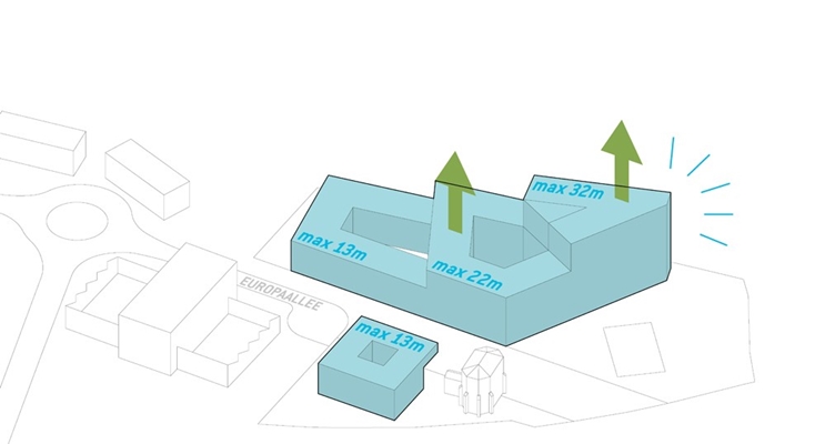 “Hierdoor ontstaat een bijzonder, sculpturaal bouwvolume rond twee centrale atria, dat zich verschillend presenteert naar de invalswegen van het centrum, de diverse sporen en aan de Europa allee, de centrale ontsluitingsas van het gebied”, vertelt het architectenbureau.