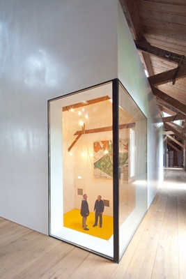 In de deels ondergrondse uitbreiding kunnen (culturele en culinaire) bijeenkomsten en exposities worden geëxposeerd. Er is bewust contrast aangebracht tussen oud en nieuw: tegen tot de ruwe en robuuste grenenhouten betimmering van de ‘schuur’ steekt de gladde witte huid van het nieuwe huisje af.