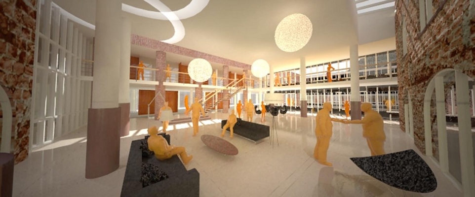 In de entreehal wordt het metselwerk teruggebracht, waardoor het monumentale ensemble van middengebouw en vleugels weer zichtbaar is. Lichtstraten in het dak vervangen de koepels en benadrukken met het ruimer binnenvallende licht dat de hal een overdekt hof is.