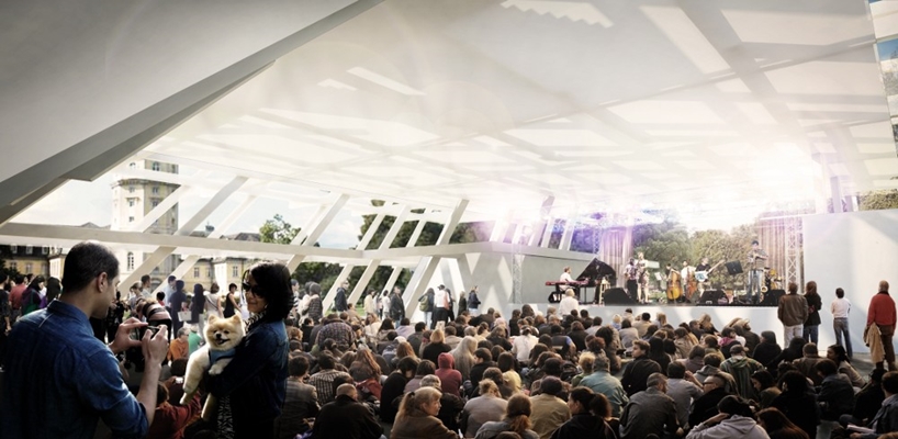 Karlsruhe viert in 2015 dat de stad driehonderd jaar geleden is gesticht. Met het oog op de zomerfestiviteiten heeft de stad een competitie uitgeschreven voor een tijdelijk paviljoen in het Schlosspark. In het bouwwerk zullen concerten, theater- en filmvoorstellingen, voordrachten en exposities plaatsvinden.