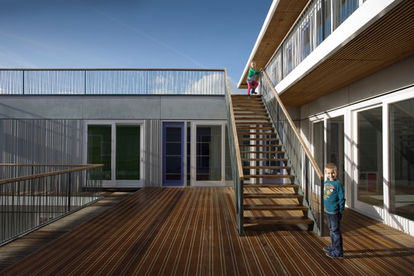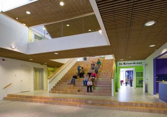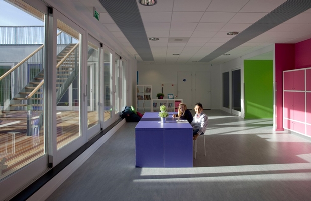 Een voorbeeld daarvan vormen de schuifwanden en –puien. Zo kunnen twee speellokalen bij de aangrenzende centrale hal worden getrokken. Schuifpuien verbinden lokalen met gaanderijen rond het gebouw en met een dakterras. Hierdoor kunnen kinderen ook in de buitenlucht werken, aldus de architecten. De gaanderijen moeten tevens fungeren als zonwering.