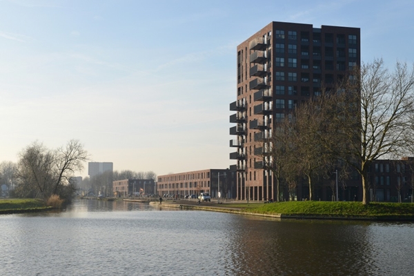 Dit doet het architectenbureau met een aaneengesloten strook grondgebonden woningen die qua schaal en materialisatie aansluiten bij de wijk. Aan de waterzijde verloopt de bebouwingslijn meanderend, waardoor een reeks openbare plekken met elk een eigen karakter ontstaat. Zo liggen er kadewoningen vlak aan het water en meer teruggetrokken woningen rond een speeltuin, een parkachtige ruimte en een stedelijk plein.