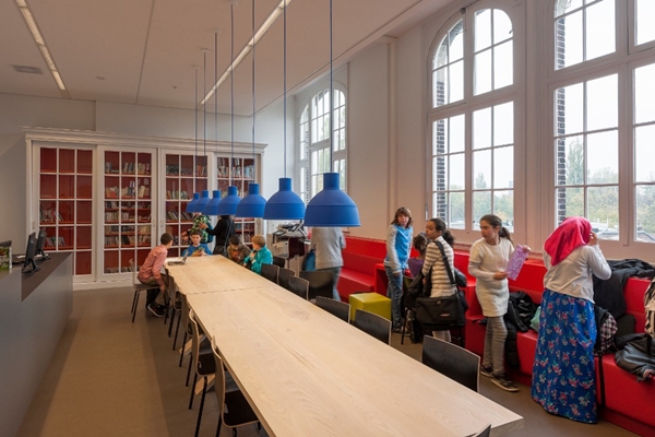 Een belangrijke ingreep in het interieur is de introductie van het ‘leerplein’. Het bureau heeft daartoe het strenge ritme van het klassieke schoolgebouw met klaslokalen doorbroken.