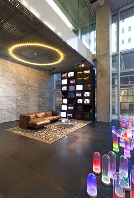 verdieping is hier een voorbeeld van. De theaterspots, projecties en neon-signing hier doen eigenlijk meer denken aan een poppodium of nachtclub dan aan het hotel.