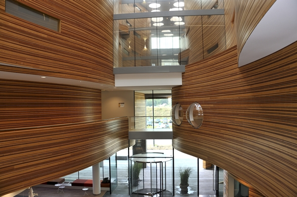 De receptie is een ellipsvormig volume, aansluitend bij de ‘canyon’, dat overgaat in een bar. Hier omheen liggen de lounge, de ontbijtruimte en het restaurant (ontworpen door