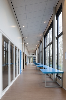 De gangen stralen rust uit doordat ze vrij zijn gehouden van kapstokken en lockers in nissen zijn geplaatst. Met de gangen als vanzelfsprekende uitbreiding van de lokalen ontstaan er leerpleinen.