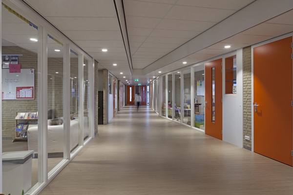 Doorbreken van het klassikaal onderwijs wordt voorts gestimuleerd door de toepassing van transparante binnenwanden met veel glas. De onder-, midden- en bovenbouw worden gemarkeerd door een eigen kleur.