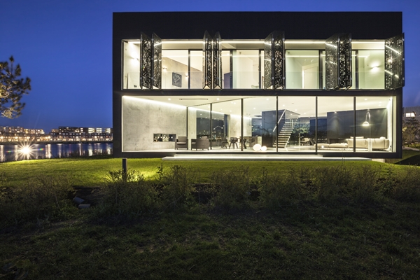 De begane grond is aan drie zijden ruim voorzien van glas, wat een sterke verbinding van het interieur met het water aan de west- en het parkje aan oostzijde creëert. Op een hoek buigt de glazen pui naar binnen. Dit versterkt de transparantie en resulteert in een overdekt terras.