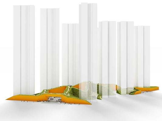 Doordat de bruggen zijn geplaatst boven de winkelstraten in nauwere gedeelten van het complex, ontstaan er pleinen. Samen met het toegankelijke groene dak moet het levendige maaiveld een aantrekkelijk voetstuk voor de woontorens vormen. De torens maken overigens geen deel uit van het door NL Architects ontworpen project.