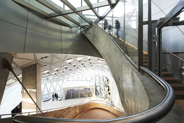“Het idee achter het gebouw kan al aan de vorm van het exterieur worden afgelezen”, zegt Wolf D. Prix van het Weense architectenbureau. “De school omhelst de concertzaal.” De U-vormige repetitiezalen en leslokalen zijn georganiseerd rond de 1300 stoelen tellende zaal, die het hart van het gebouw vormt.