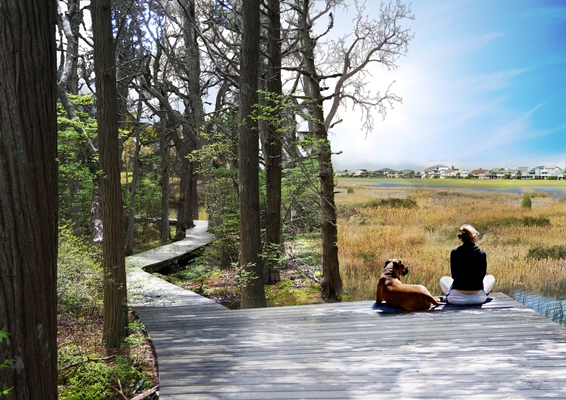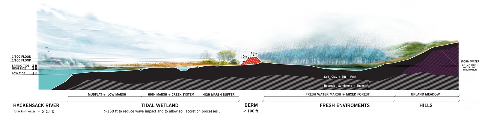 “Voor de verdediging tegen het water hebben we een dijkensysteem bedacht, waaraan nieuwe stedelijke ontwikkelingen worden gekoppeld, met uitzicht op het moerasland. Dat laatste loopt bij hoog water onder, hoogt zichzelf op met sliblagen waarop vervolgens nieuwe planten zullen groeien. Dit systeem, dat Building with Nature heet, groeit mee met de zeespiegelstijging. De natuur is hartstikke slim, daar moeten we ons voordeel mee doen in het stedelijke systeem.”