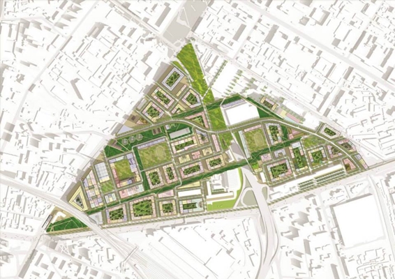 “Grotere fabriekshallen worden deels vervangen door stedelijke blokken met dezelfde basis en met nieuwe groene binnenterreinen. Deze blokken worden in verschillende gebouwen opgesplitst met verschillende hoogtes en functies waardoor de wijk meer gedifferentieerd wordt.”