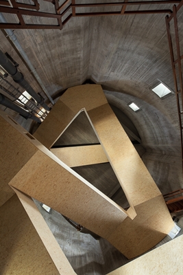 De reis naar boven begint met een dichte trap die de bezoeker naar de eerste verdieping op vier meter hoogte brengt. “Hier sta je in een 24 meter hoge ruimte met een spektakel van oude en nieuwe trappen¸ vertelt Zecc. De trap door de romp van de toren is uitgevoerd, als contrast voor de betonnen wanden en om een natuurproduct zonder enige afwerking in te zetten.