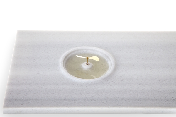 De Aer zorgt voor een geleidelijke verspreiding van parfums op water- of alcoholbasis. Vanuit een glazen reservoir druppelt geurig water – een bijproduct van het distillatieproces van essentiële oliën voor de parfumindustrie – met trage regelmaat op een plateau van wit beton en marmerpoeder. De vloeistof wordt geabsorbeerd door de poreuze structuur van het materiaal en door verdamping komt het subtiele aroma vrij.