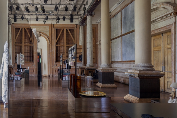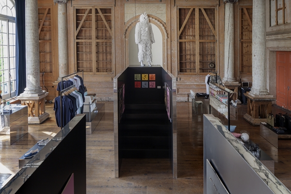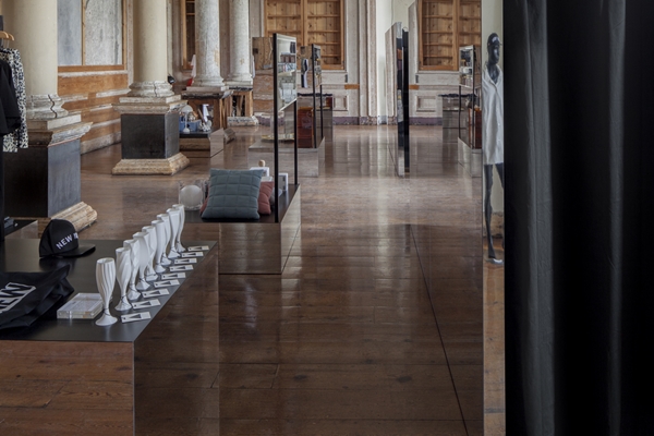 twee winkels voor design- en architectuurmagazine Frame ingericht. Het bureau heeft van de Zuilenzaal een ‘spiegelend universum’ gemaakt.
