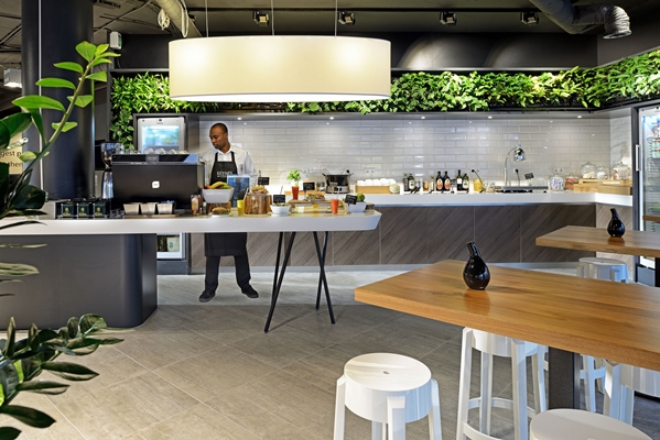 De lobby is een grote ruimte, verdeeld in verschillende gebieden met ieder een eigen sfeer. Zo is er een huiskamer en staat elders een stoere stamtafel. “De groene wand vormt een tegenwicht voor de harde materialen zoals de tegelvloer”, zegt Mulder, “maar de levende wand is ook een mooie overgang van de groene omgeving naar binnen.”