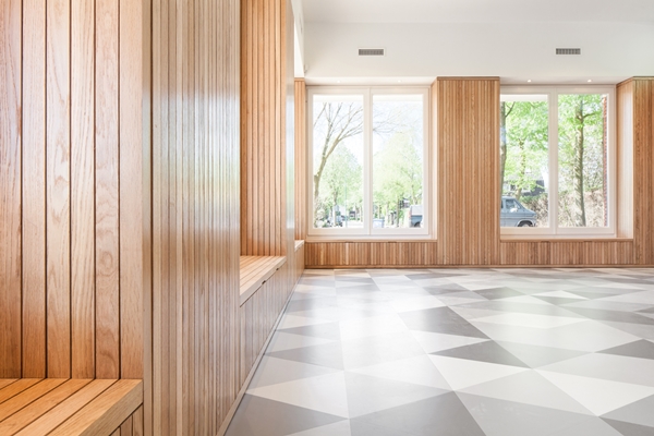 Ook aan de binnenzijde van de ramen zijn diepe vensterbanken gemaakt. De vensterbanken en penanten in het interieur kunnen worden gebruikt als opslagruimte. In de eikenhouten lambrisering zijn kasten en kisten opgenomen, zonder dat dit zichtbaar is, zo stelt Mulders vandenBerk. Het eikenhout is rondom toegepast, zodat het de ruimte als het ware omarmt en zorgt voor een prettige sfeer.
