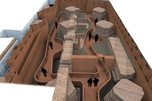 Het pad voert de bezoeker langs de direct tastbare archeologie. Op plaatsen waar geen archeologische vondsten zijn, plaatsten de architecten CorTen-stalen wanden, voorzien van perforaties van bijvoorbeeld een Romeins hoofdgebouw of gotische glas-in-loodramen. Deze wanden kunnen van achter worden aangelicht.