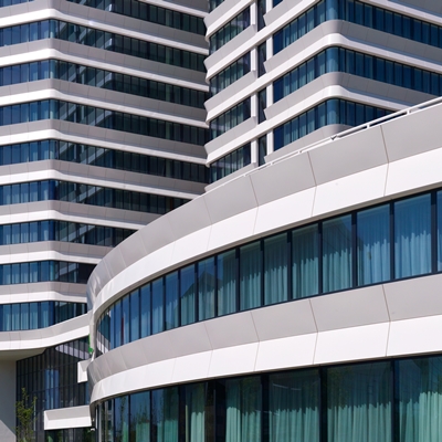 De oorspronkelijke dynamische gebouwvorm heeft het architectenbureau weten te behouden met de sterk horizontale geleding en diepe profilering van de nieuwe gevel. ZZDP en Mulderblauw architecten hebben daarbij de complexe opgave opgelost om de gevel te moduleren naar een maatvoering, die geschikt is voor het huisvesten van twee hotelformules met twee verschillende kamerbreedtes.