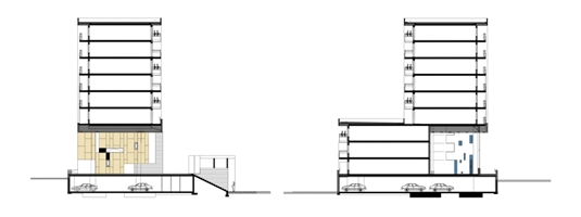 “Vanaf de kant van de sportvelden blijft het bos zichtbaar, doordat de kruinen van de bomen boven de lagere bouwvolumes uit steken. Een hoge centrale poort maakt een openbare voetgangersroute door het complex mogelijk en geeft op straatniveau direct doorzicht naar het boomrijke deel van het plantsoen”, zegt HVE Architecten.