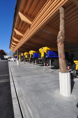 Beide stallingen zijn aan de buitenzijde gerealiseerd als een groen talud, waarmee 24H-architecture de impact van de gebouwen op de omgeving heeft geprobeerd te minimaliseren. De houten hoofdconstructie overspant zestien meter – met het oog op maximale manoeuvreerruimte – en wordt gedragen door boomstammen. De opbouw van de constructie gaat hiermee van grof aan de onderkant naar fijn aan de bovenkant.