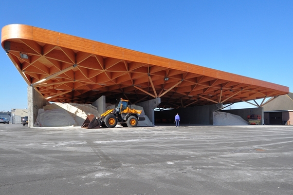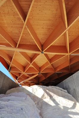 Een groot houten dak beschermt het zout als een paraplu tegen de belangrijkste weersinvloeden. Met het oog op een grote manoeuvreervrijheid voor de shovel, moet het dak voldoende vrije hoogte hebben en kan het tegelijkertijd geen extra constructie op de begane grond hebben. Daarom rust het grote dak op 48 houten stammen, die afsteunen op de betonnen wanden. Dit versterkt het beeld van de paraplu en de lichtheid van het dak.