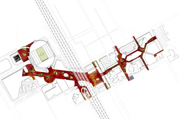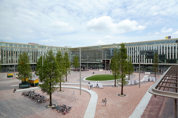 Het ontwerp is gebaseerd op de logische loopverbindingen door het gebied. De loopstromen worden begeleid door randen van natuursteen, die hoogteverschillen op het plein overbruggen en tevens voor verblijfsplekken zorgen. De natuursteen randen in combinatie met de bestrating van klinkers sluit aan op de, eveneens door Karres en Brands ontworpen, inrichting van de Arena Boulevard en Amsterdamse Poort.