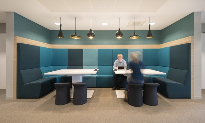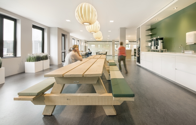 “Meer naar het midden van de werkvloer liggen, bij de stijgpunten, de zones waar meer drukte en levendigheid heerst. Hier bevinden zich ook de lockers, pantry’s en plekken voor open en informeel overleg. Middels de vides is hier ook contact tussen de verdiepingen bewerkstelligd”, zegt De Twee Snoeken.