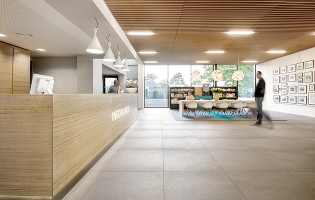 “Het gaat hier om kleuraccenten die op wanden, tapijt of meubels zijn aangebracht en worden gecombineerd met basismaterialen als Plexwood, die in het hele gebouw zijn toegepast. Door de overeenkomst in structuur, indeling en toepassing van basismaterialen is het interieurontwerp, ondanks de toepassing van verschillende kleuraccenten, toch één geheel”, aldus het architectenbureau.