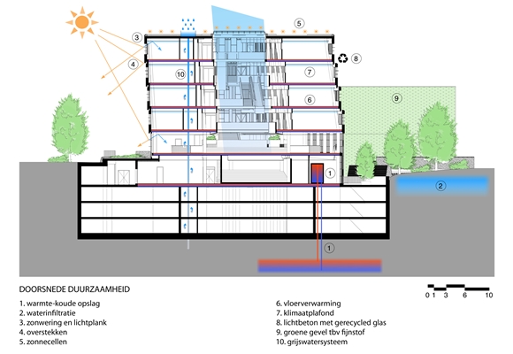 Daartoe zijn allerlei maatregelen genomen, zoals een grijswatersysteem voor het sanitair, toepassing van cradle-tocradle-materialen in bijvoorbeeld vloerbedekking en daglicht en ledverlichting als duurzame lichtbronnen.