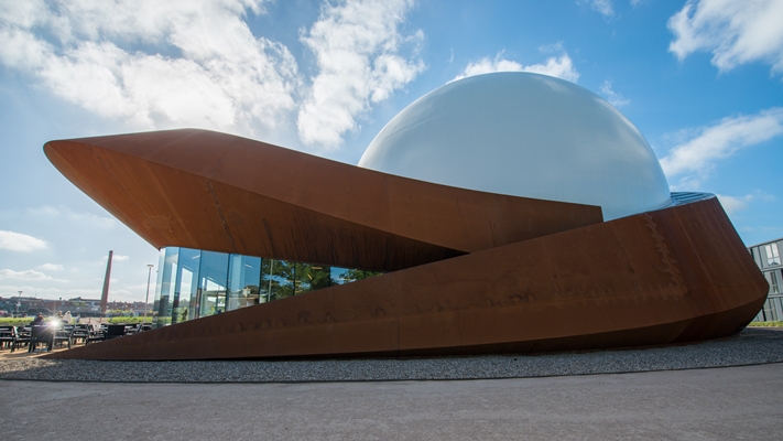 kunnen er kijken naar 3D-films en andere visualisaties over wetenschap, kunst en cultuur. Het gebouw, dat in de volksmond ‘het oog’ en ‘de ufo’ wordt genoemd, is ontworpen door