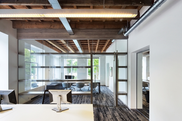 In aangrenzende ruimtes is de werkelijke historie juist in het zicht gebracht door de balklagen te strippen. Op de eerste etage zijn de oude houten balken en enkele originele details zijn gecombineerd met moderne elementen als glazen scheidingswanden en een tapijt, dat dan weer een plankendessin heeft, naar ontwerp van Mentjens.