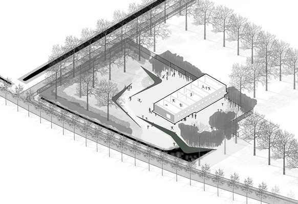 De Buitenplaats wordt een schakel tussen het dorp en het landschap, vooral door meer reliëf aan te brengen op het monotone terrein. Dankzij taluds die zijn opgetrokken uit beton ontstaan verschillende speelzones en krijgt het terrein een gevarieerder karakter. “De glooiingen van een beekloop worden gecombineerd met de robuustheid van een fortificatie”, meldt The Cloud Collective.
