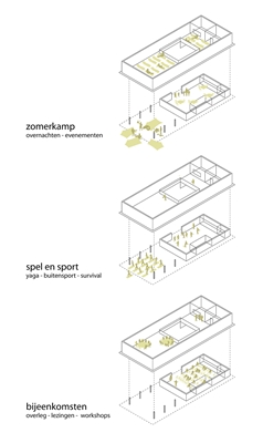 “Op de begane grond bevindt zich een multifunctionele zaal die gebruikt wordt voor lezingen, sport en spel en die tevens als eet- en slaapzaal ingezet kan worden. Deze dubbelhoge ruimte verbindt het speelveld en de overdekte buitenruimte met de overige functies in het gebouw.”