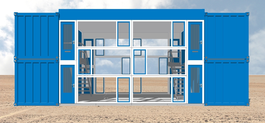 Het paviljoen bestaat uit zeecontainers en hergebruikte materialen, zoals de door Woonbedrijf geleverde kozijnen van de gerenoveerde woningen uit de wijk