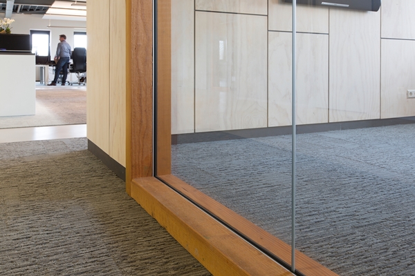 De werkplekken staan op 'kleden' op de betonnen vloer. Bij uitbreiding van het personeelsbestand kunnen eenvoudig meer van deze eilanden uit tapijttegels worden gelegd. Ook voor de vergaderkamer is met tapijt een duidelijke plek op de vloer gecreëerd. De vergaderruimte wordt afgescheiden door een grote glazen wand in een houten kozijn.