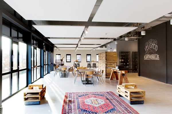 Mensink heeft een open en helder interieur ontworpen, waarbij vooral eenvoudige en duurzame materialen zijn toegepast. Zitelementen uit oude pallets en kisten, ruw houten wanden creëren afscheidingen - voor bijvoorbeeld de garderobe - en stalen krukken dragen bij aan een stoere uitstraling. Dat geldt ook voor het zicht op het staal van het plafond.