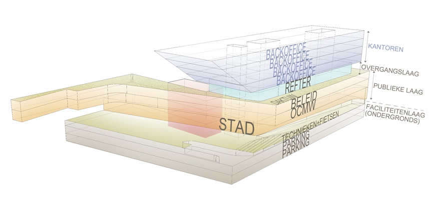 Een verdere indeling van de nieuwbouw zal voortvloeien uit de resultaten van werkgroepen, participatietrajecten met inwoners van Hasselt en overleg met personeelsleden van de gemeentelijke diensten. Wel is bij de bepaling van de functionele oppervlakte rekening gehouden met flexibiliteit, zodat eventuele organisatorische wijzigingen in de toekomst kunnen worden opgevangen.