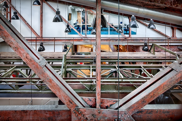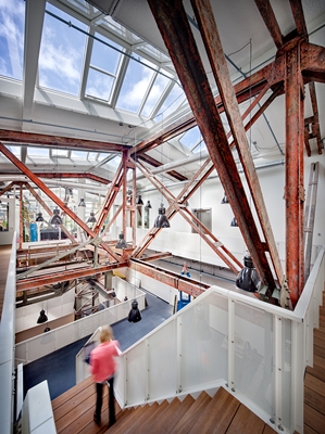 Een grote houten trap en een veertien meter hoog atrium vormen het hart van de hoofdloods. In dit atrium hangt de oude loopkraan. De vloeren zijn teruggebracht naar de oorspronkelijke hoogte en de ramen zijn verdiepingshoog.